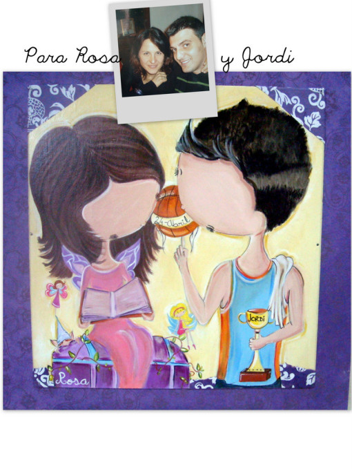 Ilustración para el aniversario de Rosa y Jordi, ella educadora infantil, dulce, amante de los cuentos, hadas y la fantasía en general. Él entrenador de basket y amante del deporte. Felicidades chicos!!!!